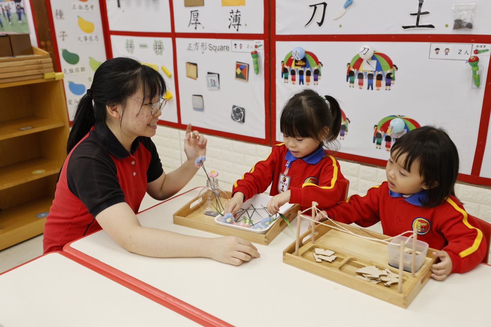 1. 學校設有蒙特梭利學習區角,採用「蒙氏實驗教學法」為基礎,刺激兒童感官知覺,從動手中學習基本動作、照顧自己、生活禮儀,並訓練大小肌肉及手眼協調動作,培養專注力及自我修正能力,從而培養觀察和探索能力,並按興趣及能力自由選擇多元化的教具及學習區,鼓勵自發學習,提升積極學習的動機。
