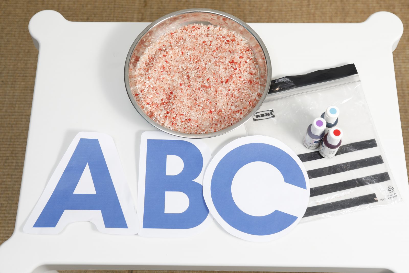 Step2:把染了色的米,倒進放有字卡的盤內