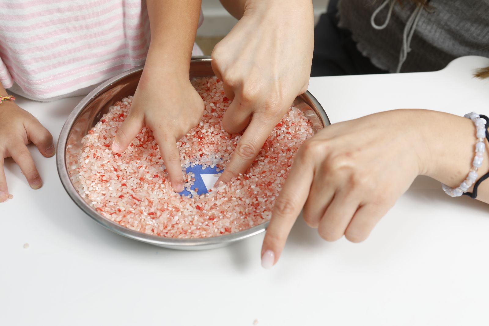 目的:小朋友用手指在米上寫字時,跟平日用筆在紙上寫字時觸感不同,有感官刺激作用,刺激多元感官發展中,大腦與神經的連結。