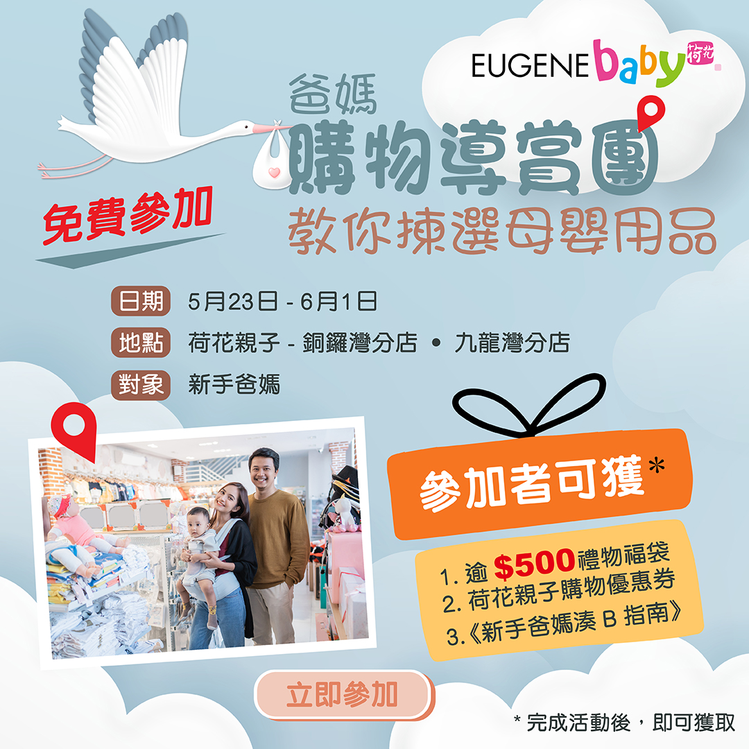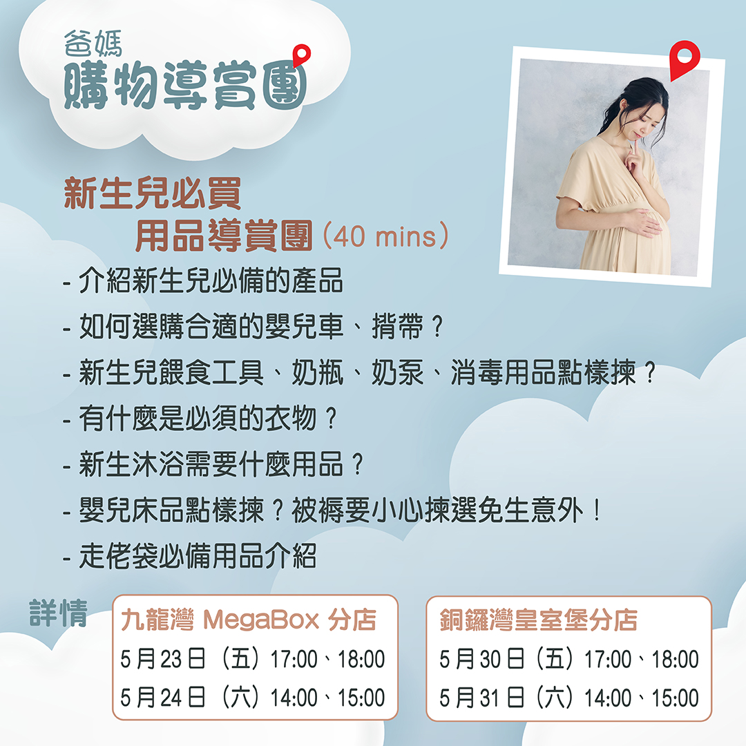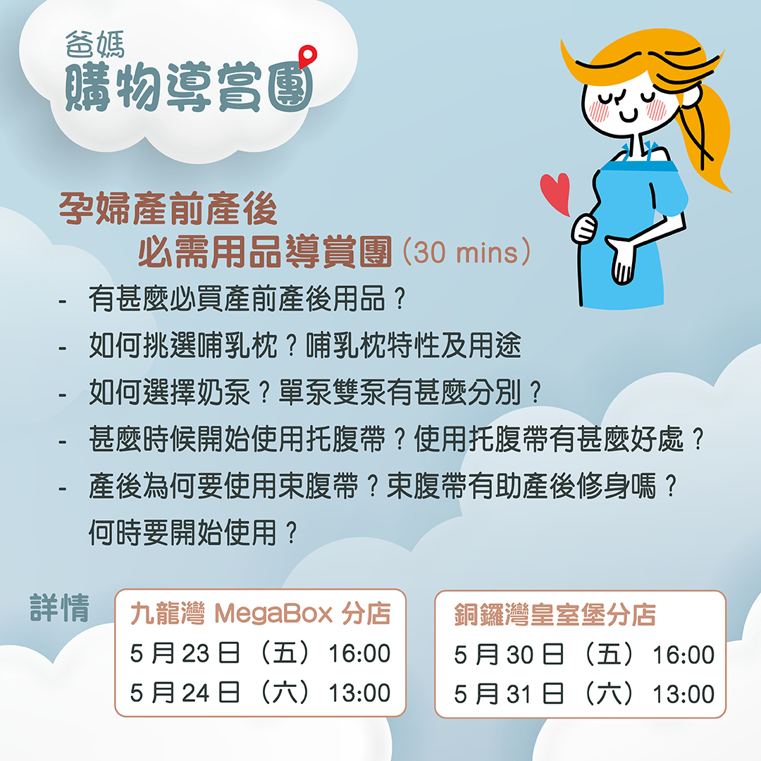 新手爸媽在孕期時,已經要開始準備孕婦產前產後及BB出世後的物品,但面對眾多物品,相信爸媽都會感到無從入手。「爸媽購物導賞團」即場教各位準bama如何選購最適合自己及BB的產品,包括:媽媽產前產後用品、新生兒必買用品及汽車安全座椅,更會即場解答大家對產品的疑問。完成導賞團後更可獲得價值$500禮物福袋及購物優惠券。