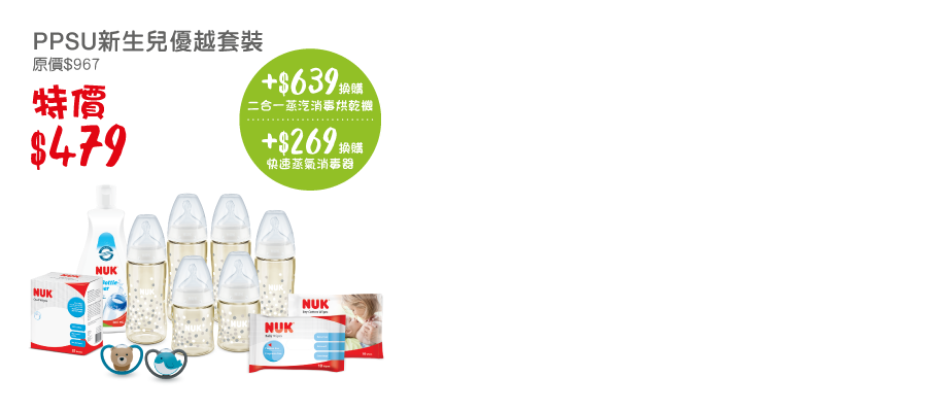 會場購買此套裝,更可以以$639換購NUK二合一蒸氣烘乾機或$269換購NUK快速蒸氣消毒器!