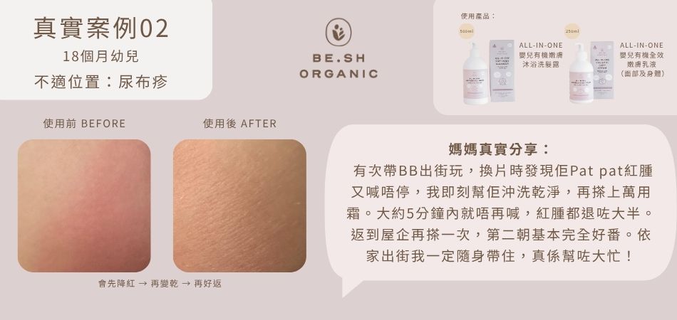 「我有一對雙胞胎兒子,哥哥膚質正常,弟弟卻從小受濕疹困擾。試過市面許多聲稱溫和的產品都無效,直到使用 BB萬用霜,第一天就顯著減少搔癢,晚上不再因痕癢而哭醒,皮膚情況逐漸穩定下來。效果比想像中更好,現在我只信這一支。」