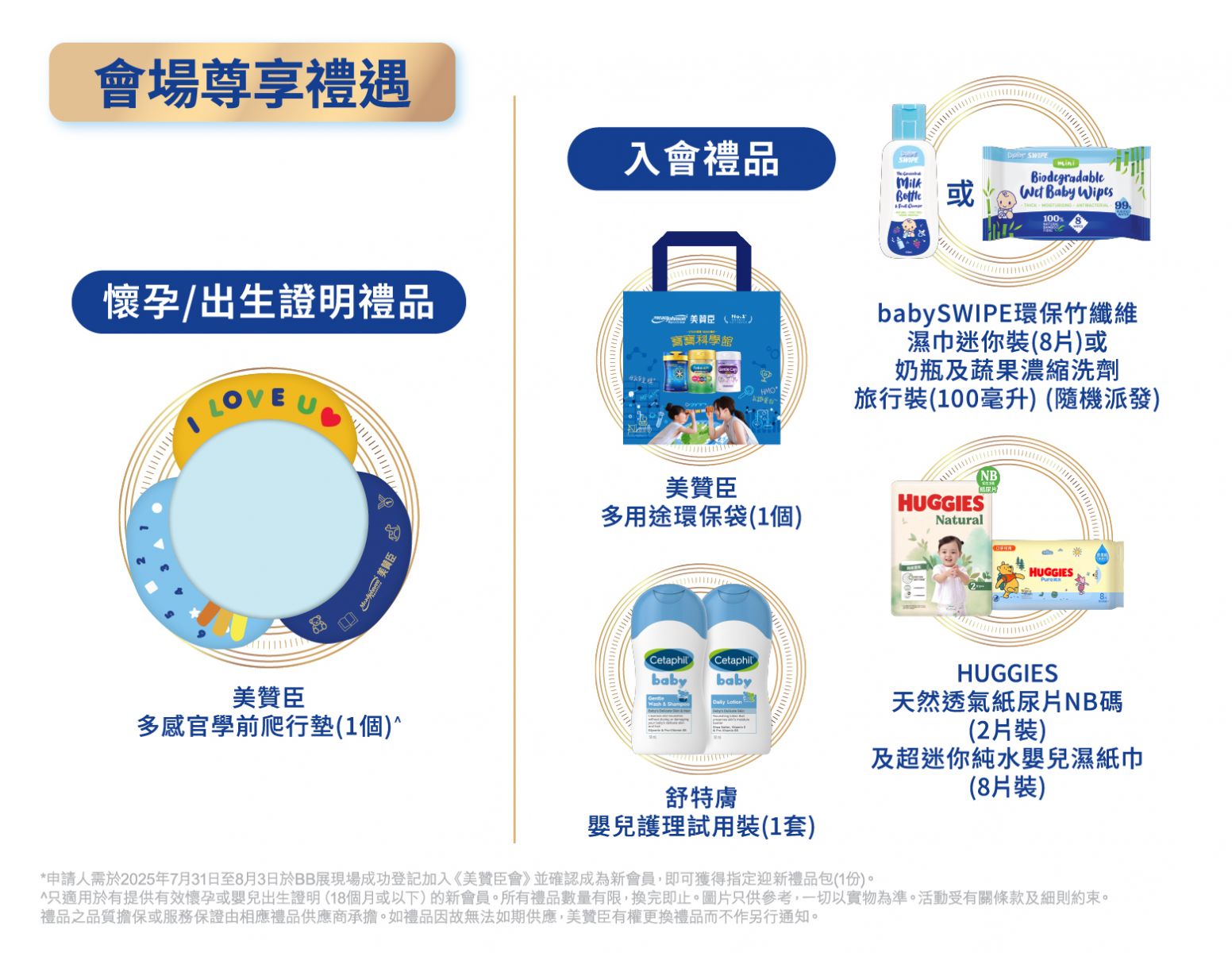 * 申請人需於2025年7月31日至8月3日親臨第33屆國際嬰兒、兒童用品博覽並成功登記加入《美贊臣會》且確認成為新會員,即可獲得指定迎新禮品包 (1份) 。