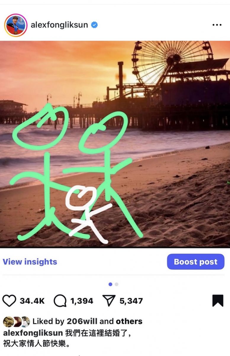 方力申今年2月14情人節同太太 Maple 於美國成婚。