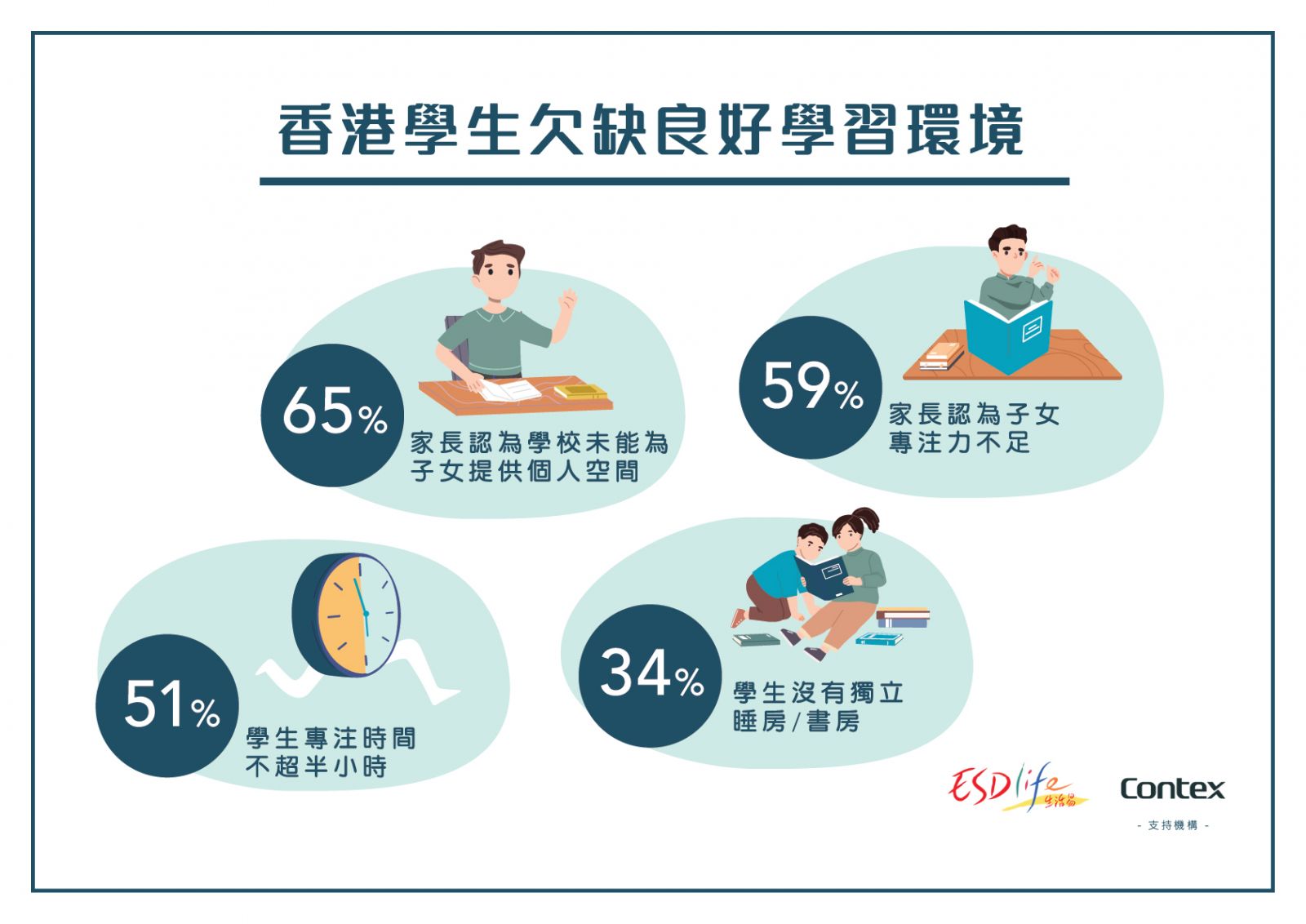 為了解學習環境對學生的影響,Contex委託生活易 (ESDlife)進行了「學習環境意見調查」,透過網上問卷訪問共 769名中學、小學及幼稚園學生的家長,以了解學生的學習環境及學習情況,以及家長對其子女學習及學習環境的看法,提升社會對學習空間的關注及意識。