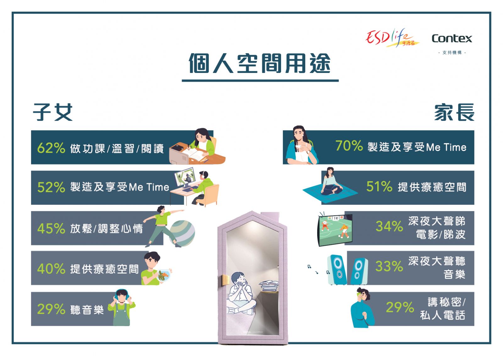 對於如果於家中增設個人空間後之用途,家長表示主要希望子女以個人空間做功課、溫習、閱讀(62%),而家長自己則較傾向製造或享受Me Time(70%)、作療癒空間(51%),及深夜大聲睇電影或睇波(34%),成有趣對比。