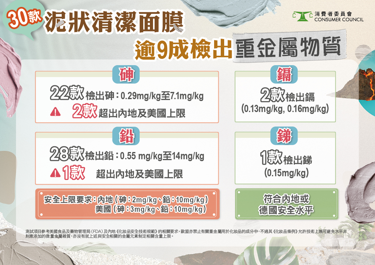 礦物泥是泥狀清潔面膜的關鍵成分,重金屬有機會天然存在於不同礦物中,工業污染亦會令重金屬物質進入地下水,因此這類產品亦有機會含重金屬雜質。雖然皮膚因短暫接觸重金屬而引發健康問題的風險不高,但若皮膚長期使用或接觸高濃度重金屬,或有傷口、發炎等情況,則有機會增加身體攝入重金屬及持續累積的風險。