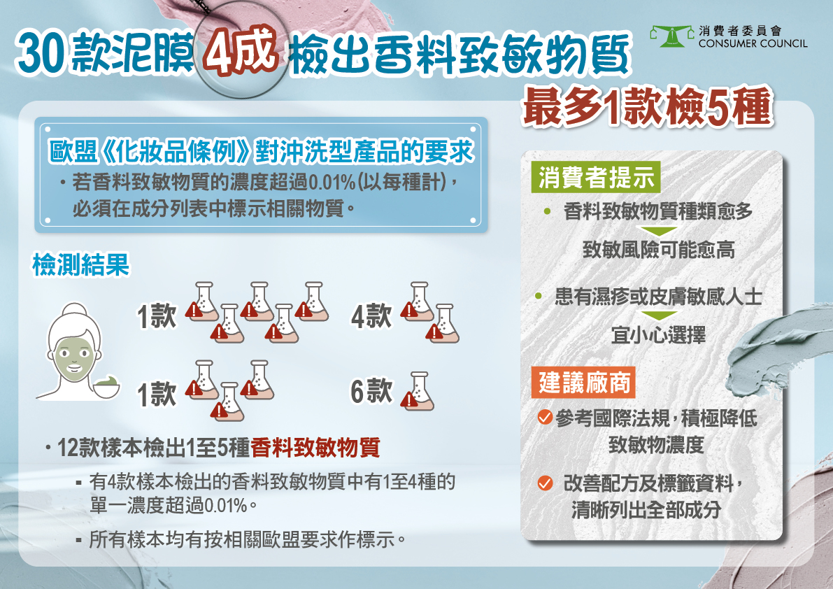 測試涵蓋 30 款以不同礦物泥為主要成分的泥狀清潔面膜,測試項目參考歐盟、美國及內地等有關要求,涵蓋重金屬、香料致敏物質、水楊酸、防腐劑及微生物安全等項目,並檢視樣本的標籤資料,結果顯示共有11款樣本獲得5星評級。