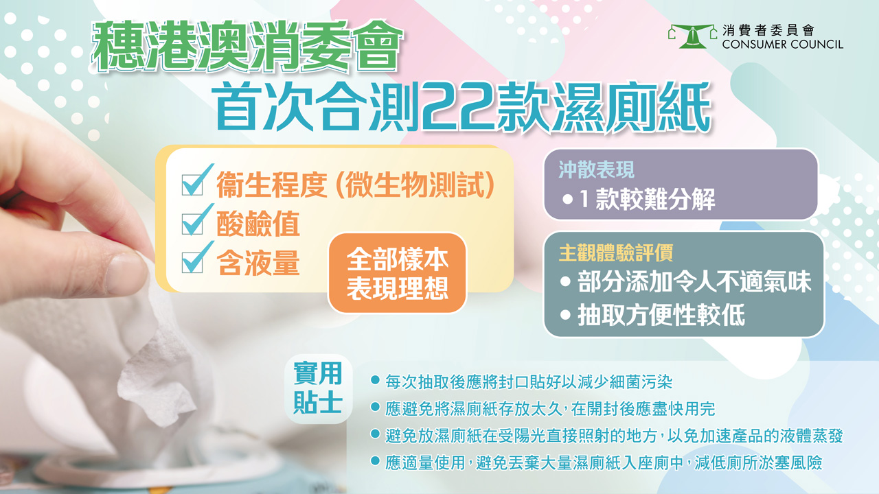 由於內地及國際間目前均未有為濕廁紙訂下相關測試標準,因而參考了內地濕巾等相關標準測試樣本的斷裂強度、破頂強度、酸鹼值、微生物、含液量及沖散表現,另對產品的外觀和使用方便程度等方面進行主觀體驗評價,總有11款取得最高的5分總評。