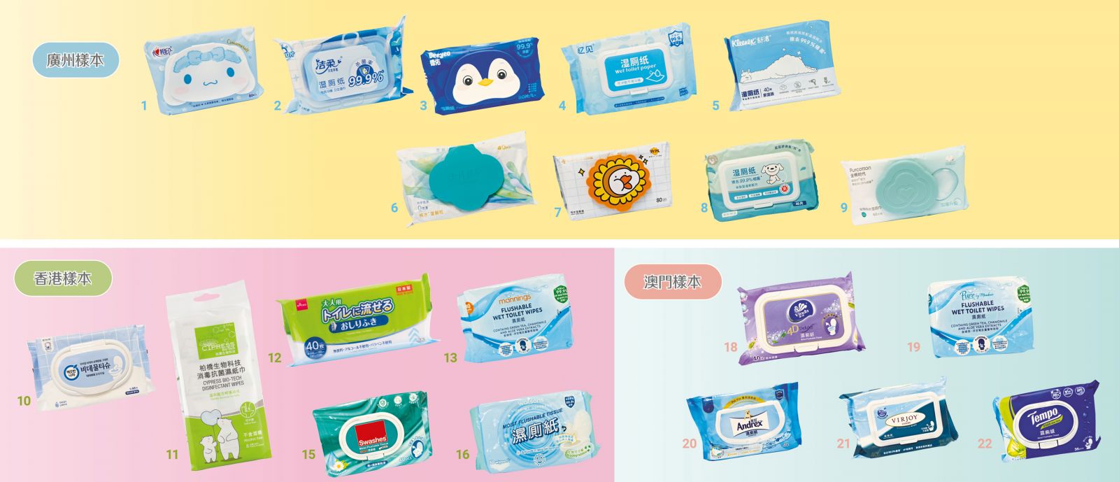 消委會測試了22款標示為「可沖式」濕廁紙產品,其中9款由廣州市消委會在廣州購買,8款由香港消委會在本港的個人護理用品店或超級市場購買,5款則由澳門消委會於澳門購買,每包價格由$4.3至$38.9。