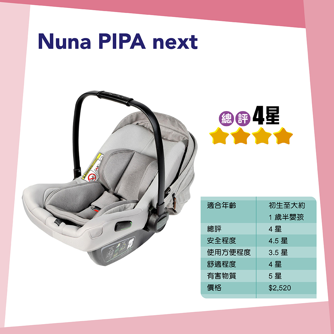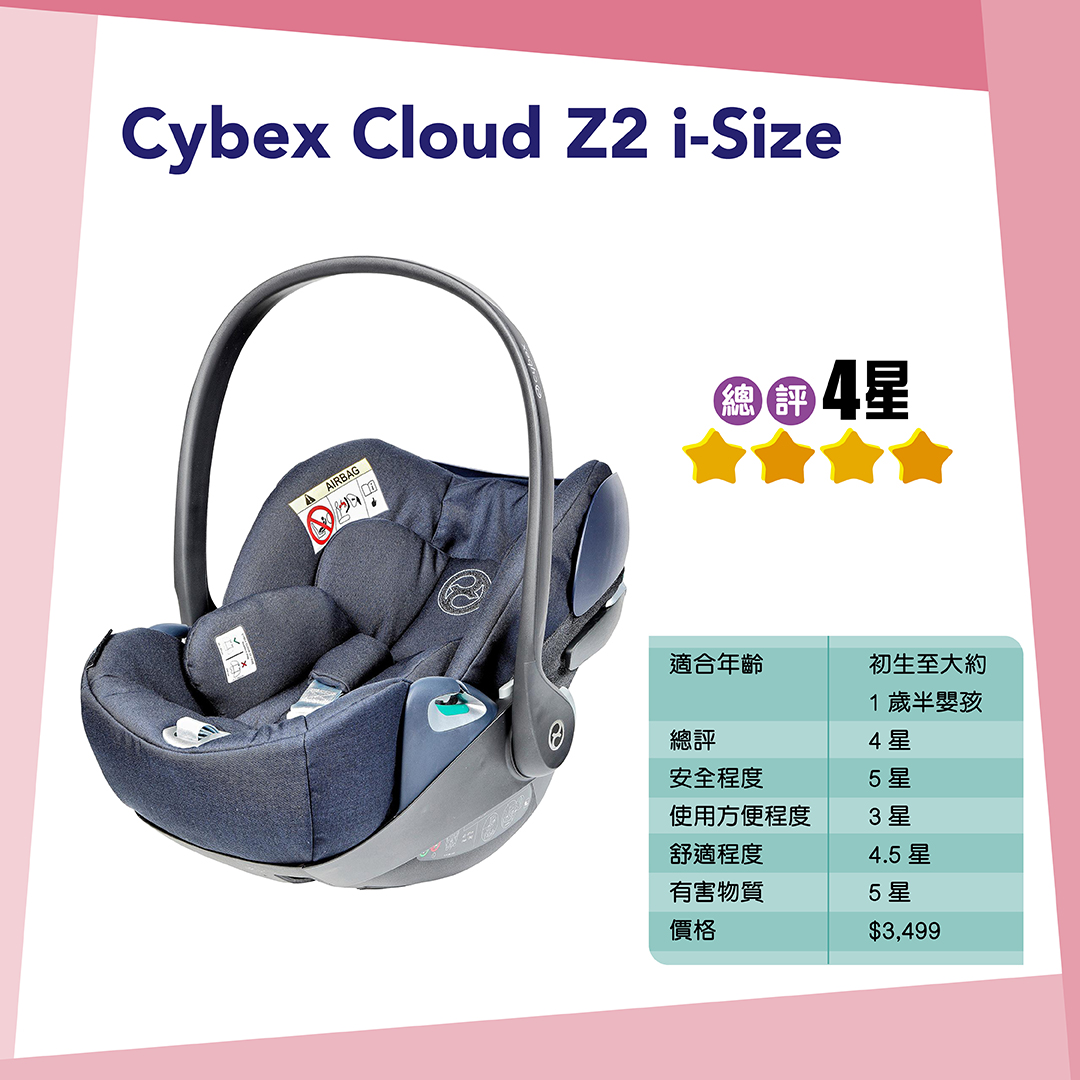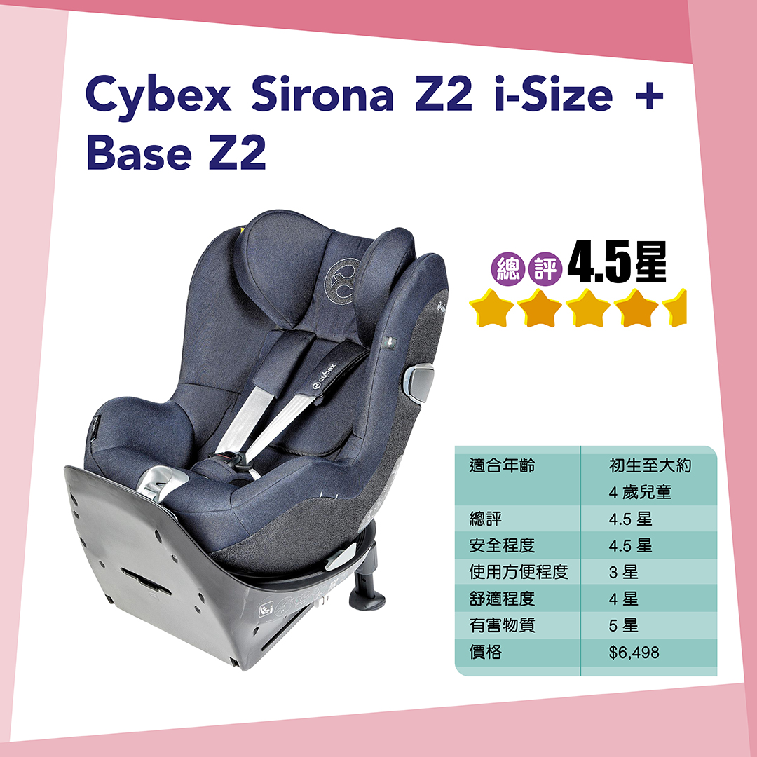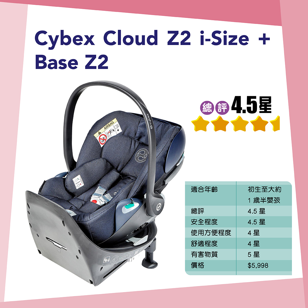 測試模擬兒童假人進行正面撞擊測試時,適用於初生至大約1歲半的Cybex Cloud Z2 i-Size + Base Z2、Cloud Z2 i-Size、Nuna PIPA next及Recaro Avan都能提供良好保護,獲5點評分。