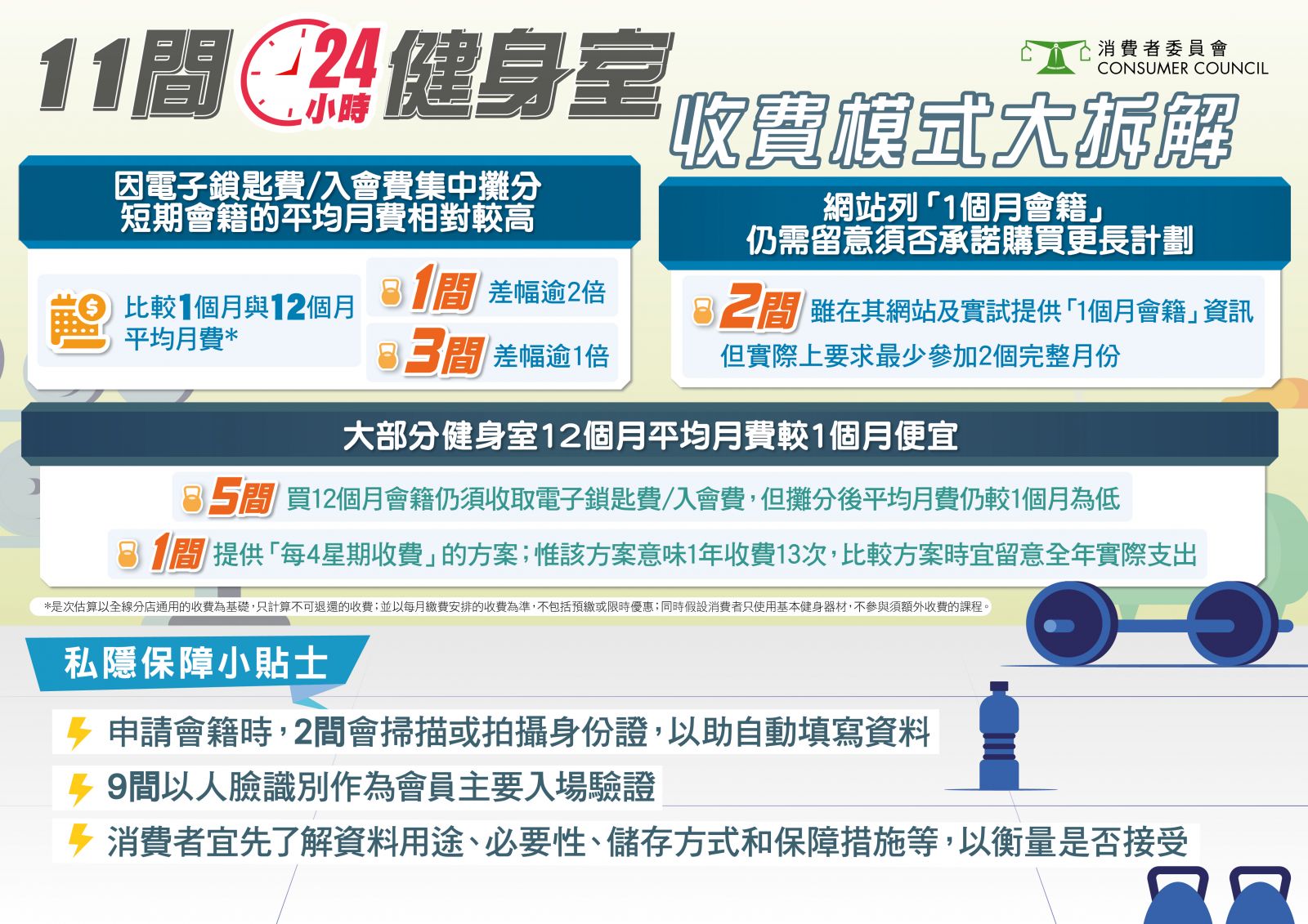 為協助消費者比較基本開支,是次估算以全線分店通用的會籍收費為基礎,只計算不可退還的收費,並以每月繳費安排的收費為準,不包括預繳或限時優惠,同時假設消費者只使用基本健身器材,不參與須額外收費的課程。