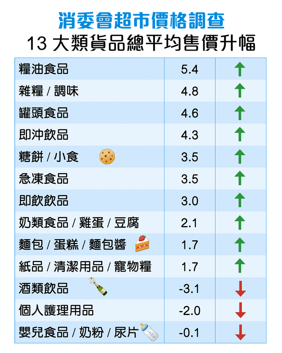 近7成貨品(175項)加價,升幅最高的貨品組別首3位分別為「牛油」(15.4%)、「茶包」(11.7%)及「芝士」(10.2%)。在13大類貨品當中,「糧油食品」、「雜糧/調味」及「罐頭食品」的總平均售價升幅最高,分別為5.4%、4.8%及4.6%。