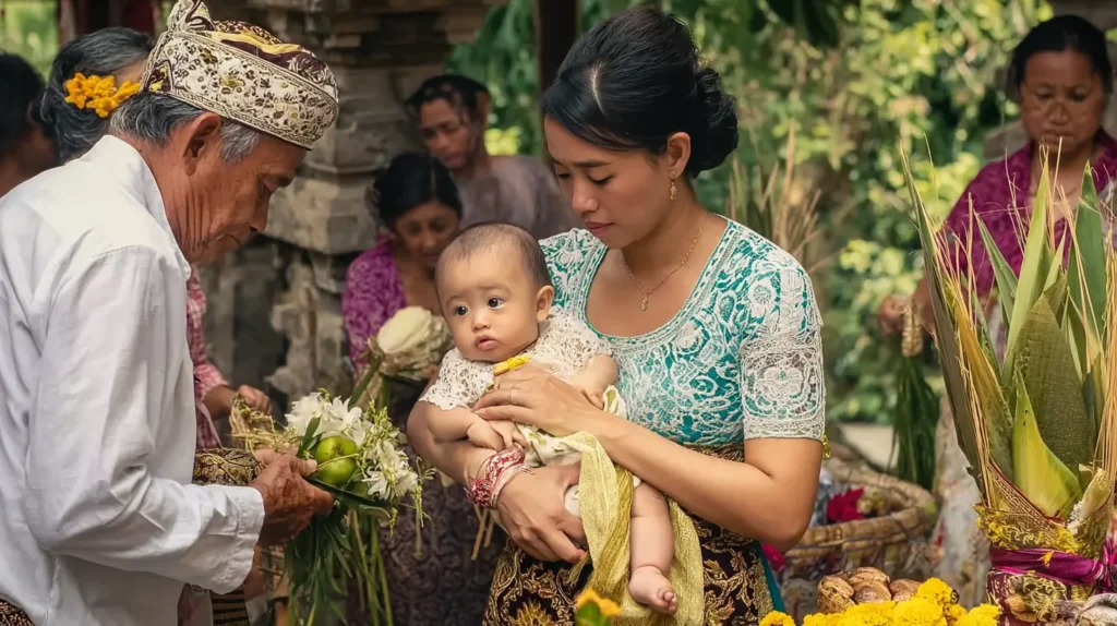 在印尼的巴厘島中,有一項名為 Nyabutan的儀式,嬰兒在出生後的105天內不會觸碰地面,因為他們認為初生嬰兒非常非常聖潔,是與靈界保持聯繫的神聖時期,所以不能受到土地污染,所以會嬰兒會一直被家人及親友輪流抱着。直至由祭司進行巴厘島印度教一系列的淨化儀式,以及祈禱和祝福後,嬰兒才可首次落地。淨化儀式當地人視為非常神聖,所以只有至親的家人和朋友才會受邀參加,儀式完結後,通常嬰兒會獲贈首飾禮物。