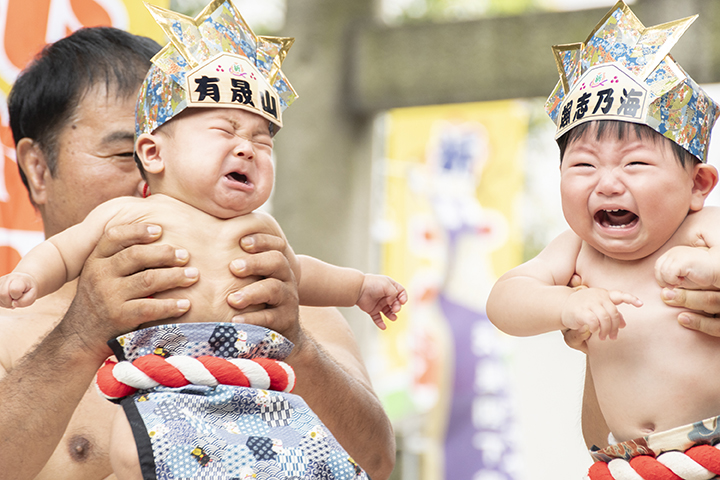 日本的「Naki Sumo」(泣き相撲)是一種有趣的傳統習俗,通常在每年的4月底5月初舉行,習俗至今已有400多年歷史,在日本許多神社中舉行,尤其在東京的淺草寺最為出名,這個儀式的目的是讓嬰兒哭泣,因為人們相信嬰兒的哭聲可以驅趕邪靈,帶來健康和幸福。