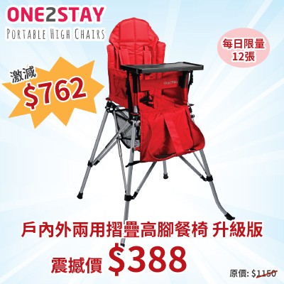 One2Stay戶內外兩用摺疊高腳餐椅僅重3公斤,非常穩定,可在數秒內展開。便攜式設計配備輕便旅行袋,方便攜帶。