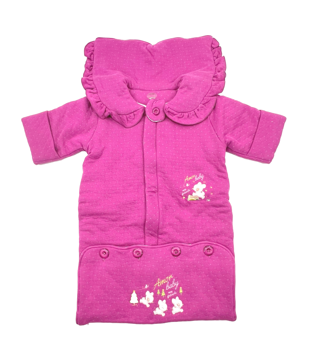 AMOR精梳棉台灣製-嬰幼兒絲絨連帽可拆卸大睡袋用料優良,厚實保暖 ,獨家專利設計之始祖, 拉鍊頂部位置有安全防刮設計,此外頂部帽子可變設計、尤其增加初生BB之安全感,腳部拉鍊可脫設計適合稍大的BB穿着。