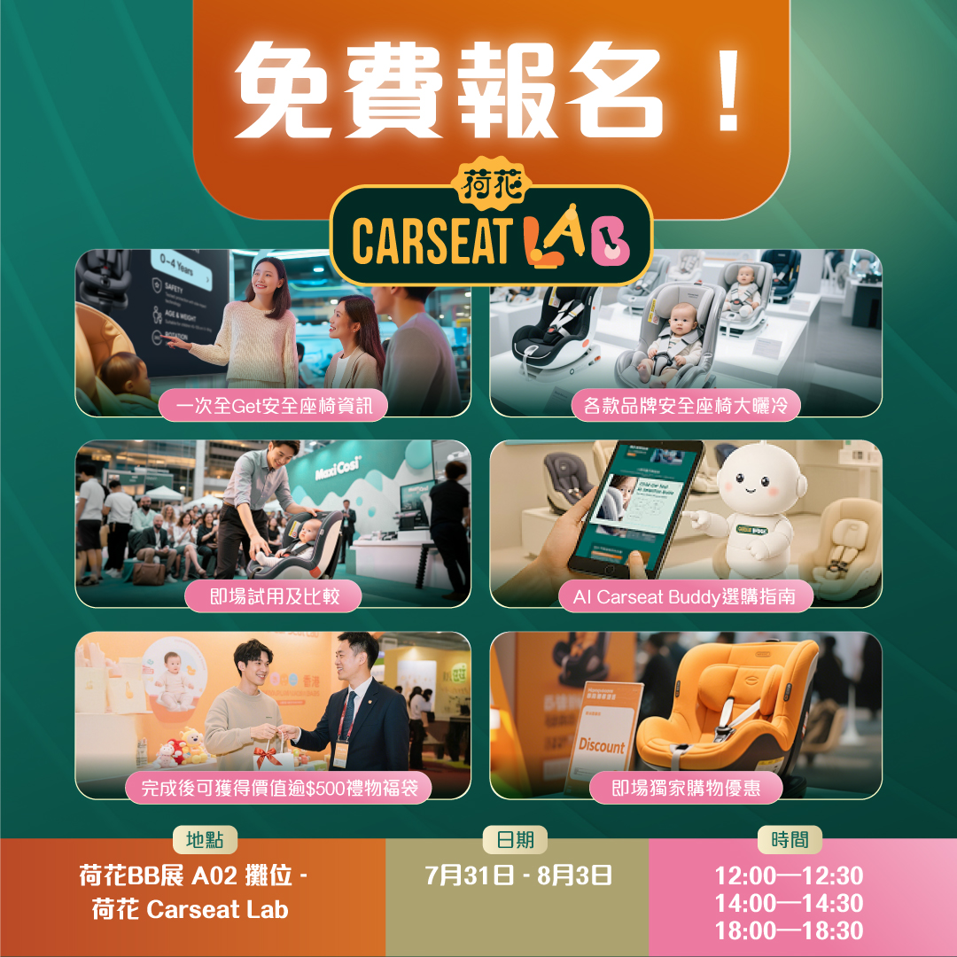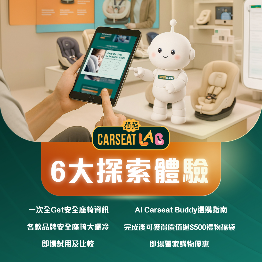 今次特設「荷花 Carseat Lab 探索體驗」活動,由專業人員講解安全座椅種類、安全標準及注意事項,即場體驗全面的汽車座椅資訊及示範,更可利用荷花AI Carseat Buddy 10秒便輕鬆幫你選擇合適的汽車座椅。完成活動後更可獲得價值逾$500禮物福袋及專屬購物優惠。