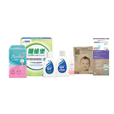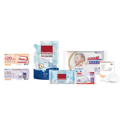 2. 合作伙伴育兒禮包,包括大王 GOO.N嬰兒紙尿片初生1片、NUK 超乾爽即棄哺乳墊、b&h 極柔優質蜂巢乳墊、詩樂氏 Swashes 濕紙巾及兒童衣服洗衣液等。