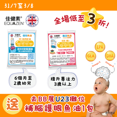 到U23 佳健素攤位,可免費換領魚油試用裝一包。佳兒魚油適用6個月至3歲幼兒;專注魚油適用3歲以上至成人。