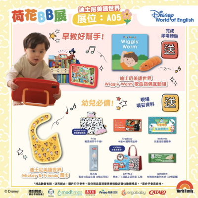 只需現場填妥資料,「迪士尼美語世界」 Mickey & Friends 圍巾及 嬰幼兒禮品優惠券包括: