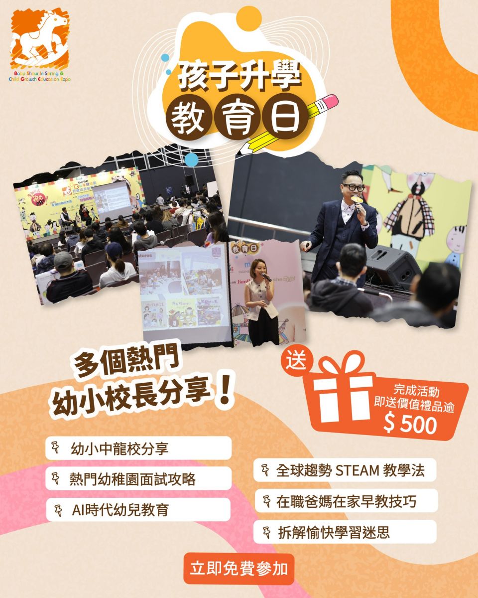 孩子升學教育日今年繼續邀請多個PN 及幼稚園校長,講解現時熱門的幼兒教育及升學資訊,包括一條龍學校特色及優勢、熱門幼小面試攻略、AI時代幼兒教育新發展、全球教育趨勢 - STEAM教學法、在職爸媽在家早教技巧等。完成活動後更可獲取逾 $500 豐富禮品包。