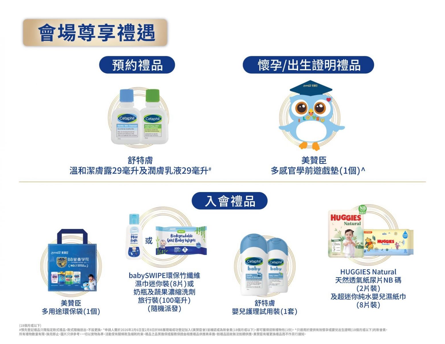 憑懷孕/出生證明(18個月或以下)成功登記加入美贊臣會,即可於展位獲限量迎新禮品包壹套 *!包括: