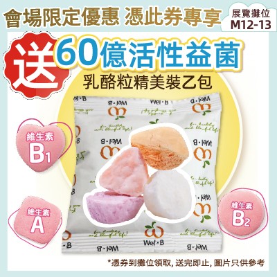 憑購物優惠券到M12,M13攤位,免費領取60億活性益菌高鈣即溶乳酪粒精美裝乙包,所有贈品數量有限,味道隨機,送完即止。