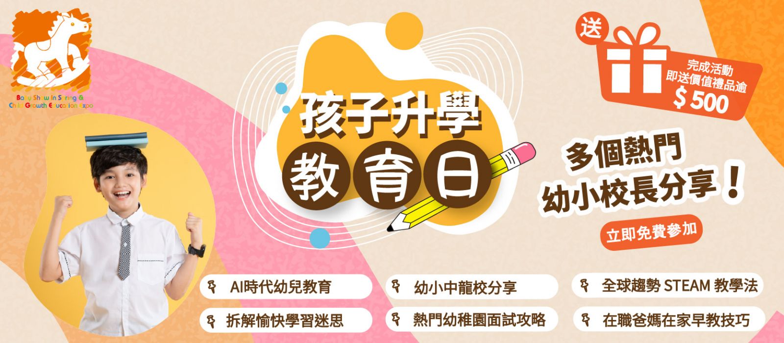 孩子升學教育日今年繼續邀請多個PN 及幼稚園校長,講解現時熱門的幼兒教育及升學資訊,包括一條龍學校特色及優勢、熱門幼小面試攻略、AI時代幼兒教育新發展、全球教育趨勢 - STEAM教學法、在職爸媽在家早教技巧等。完成活動後更可獲取逾 $500 豐富禮品包,