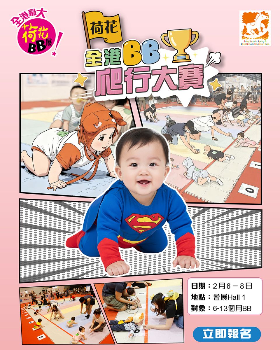 最大型的荷花BB爬行比賽是一個難忘的親子體驗,每節小組中最快完成賽事的BB將獲得冠亞季軍的殊榮,所有參加BB亦可獲證書和豐富禮品,今年更特設特設「超級英雄派對」,為BB穿上超級英雄造型,可獲得額外小禮物。所有完成比賽的BB 亦可到「爬行拍照區」,於「英雄漫畫格」的背景前體驗免費專業拍照,更可免費獲得4R照片乙張。