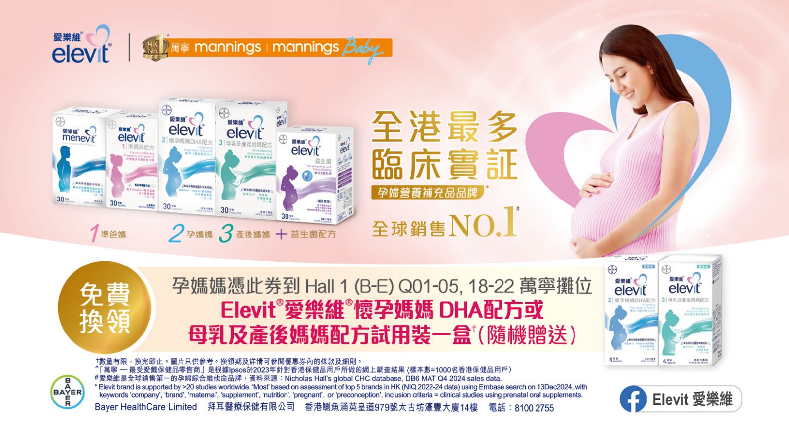 憑券可免費換領Elevit愛樂維懷孕媽媽DHA配方或母乳及產後媽媽配方試用裝1盒,款式隨機。