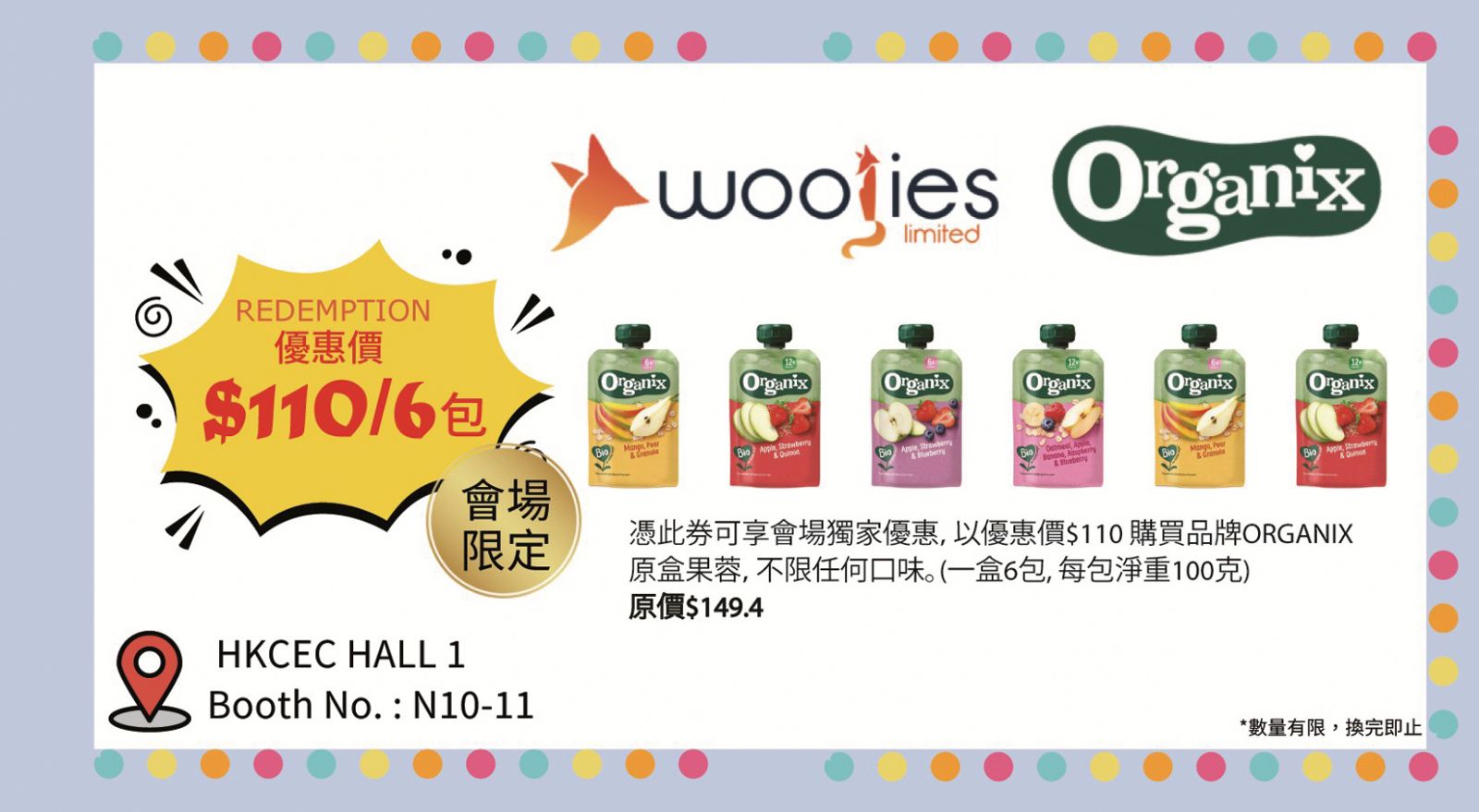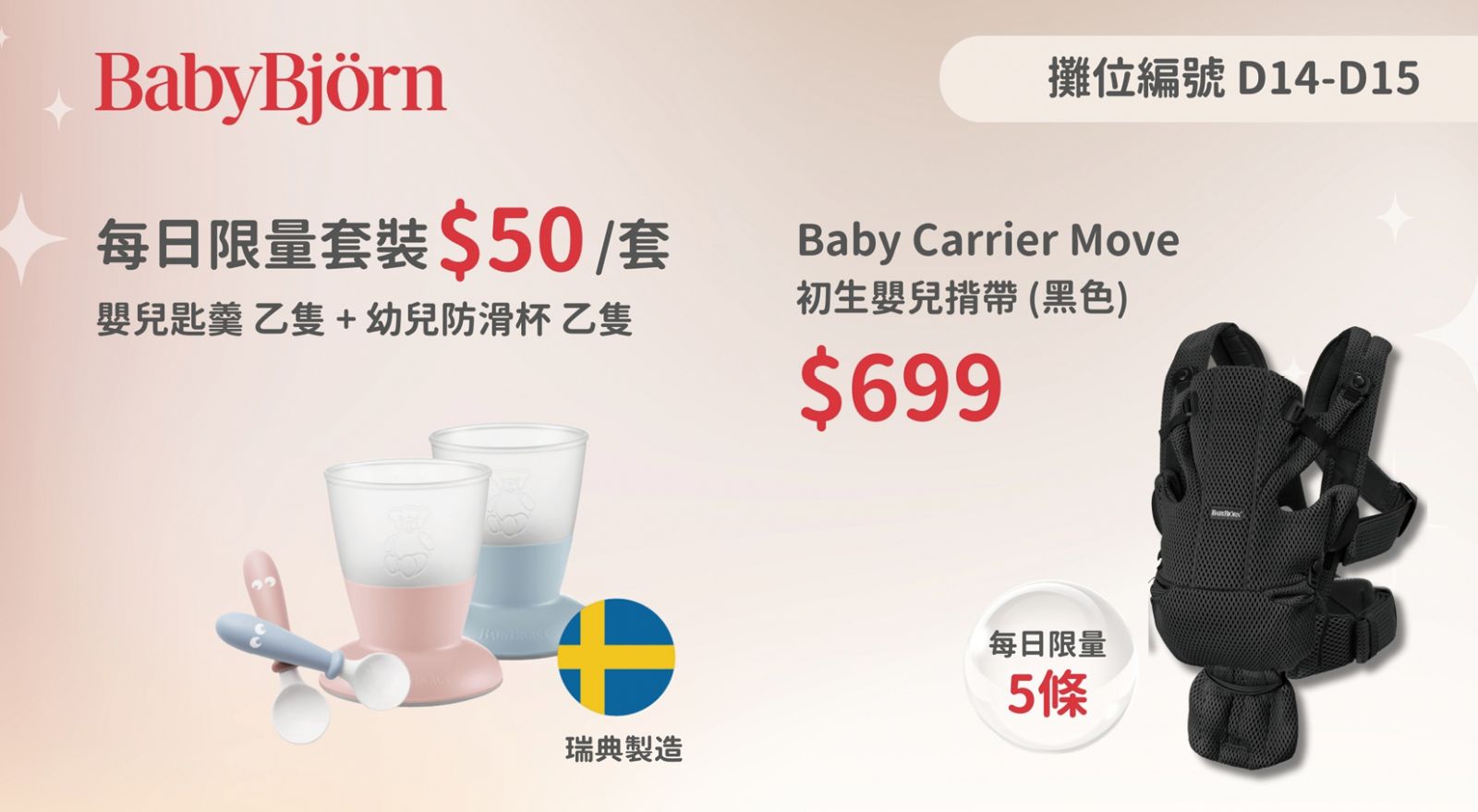 憑購物優惠券,可以優惠價$50購買嬰兒匙羹和幼兒防滑杯套裝,及優惠價$699購買Baby Carrier Move初生嬰兒揹帶(每日限量5條)。數量有限,售完即止。