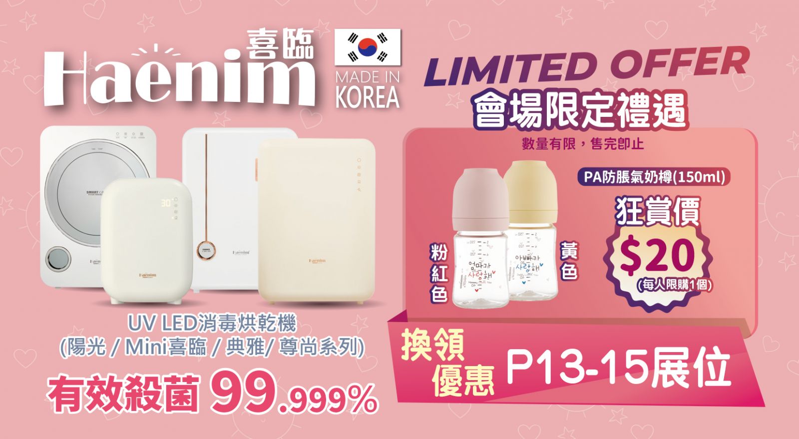 憑劵可以優惠價$20換購PA防脹氣奶樽150ml (粉紅色/黃色),每人限購1個,數量有限,售完即止