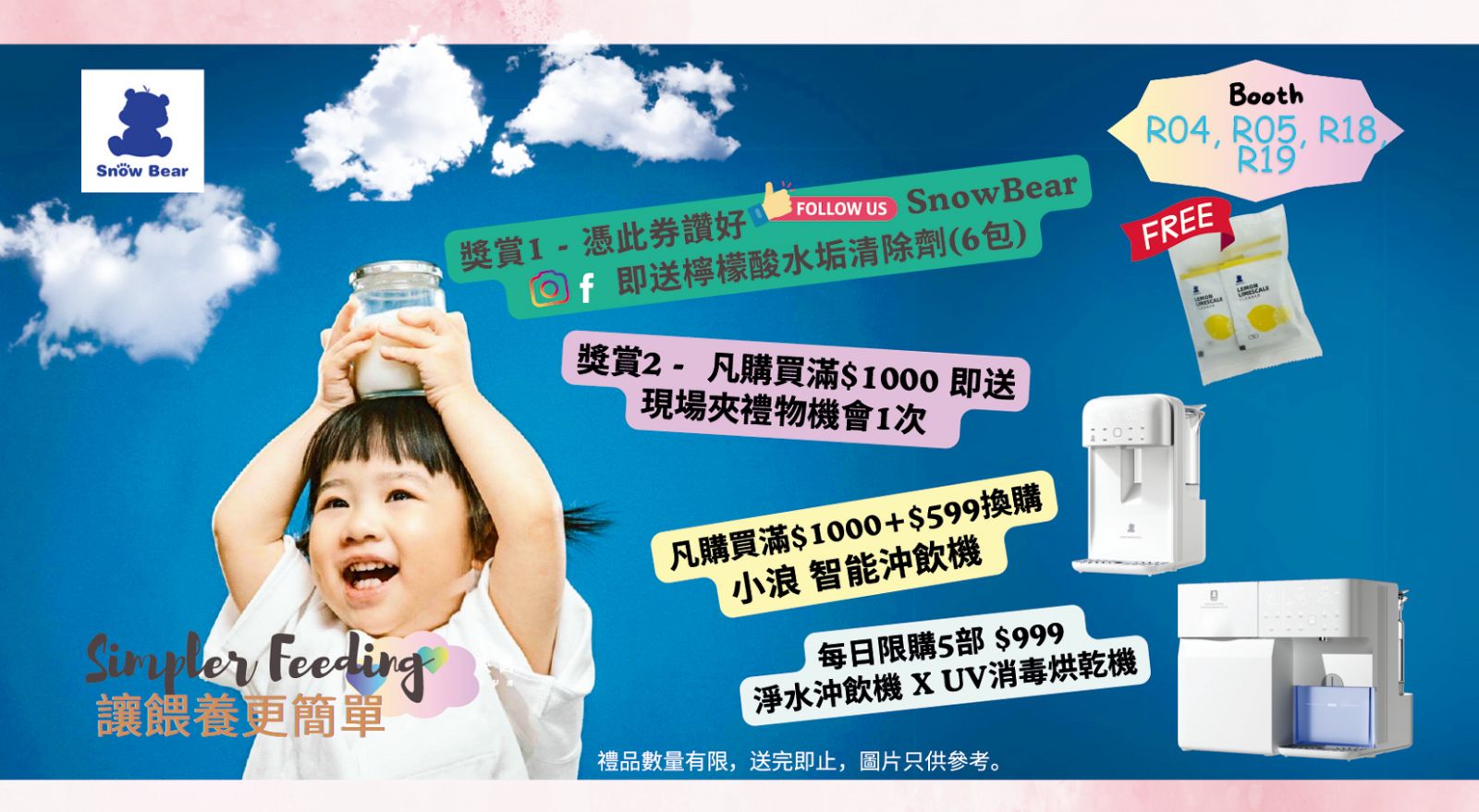 憑券及讚好SnowBear Facebook和follow Instagtam,即送檸檬酸水垢清除劑(6包)。