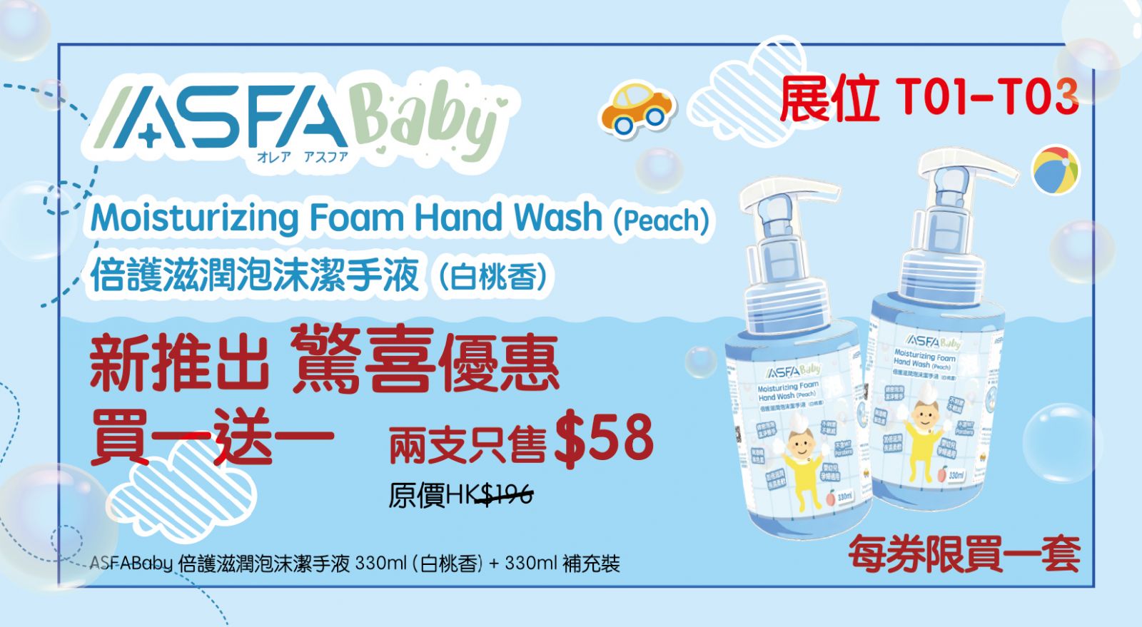 憑劵可享ASFABaby 倍滋潤泡沫潔手液(白桃香)買一送一優惠(優惠價$58/2),每券限購1套。