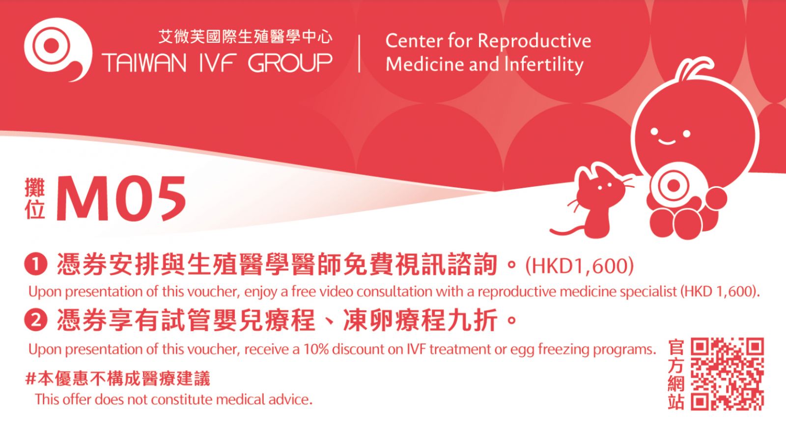 憑券可享生殖醫學醫師免費視訊諮詢(原價:$1,000),和試管嬰兒療程、凍卵療程9折。