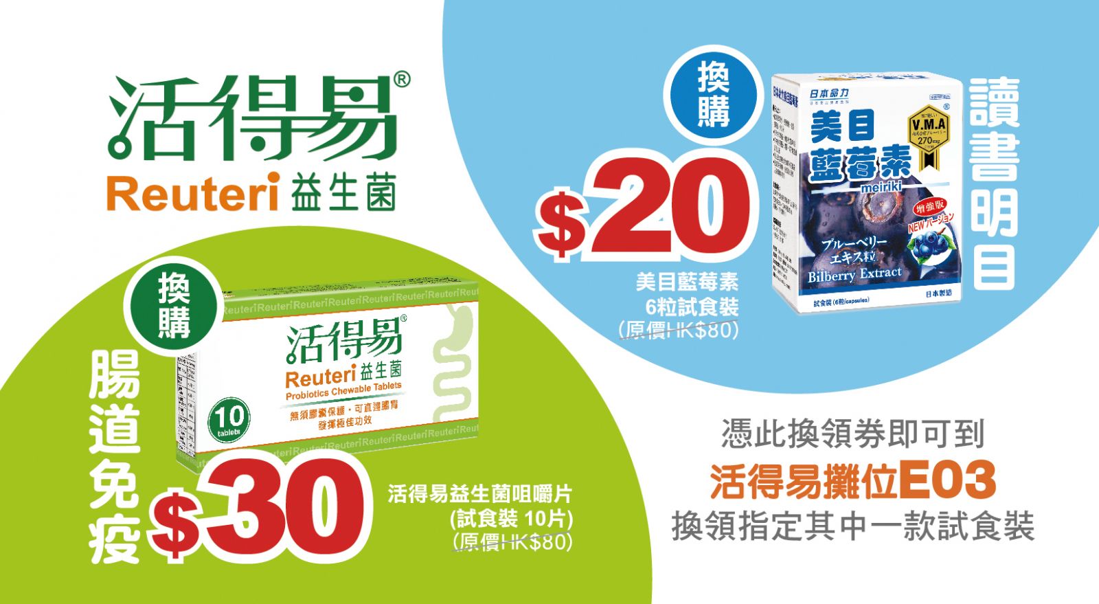 憑券可以優惠價$30換購活得易益生菌咀嚼片(試食裝10片)(原價:$80),或以優惠價$20換購美目藍莓素6粒試食裝(原價$80)。