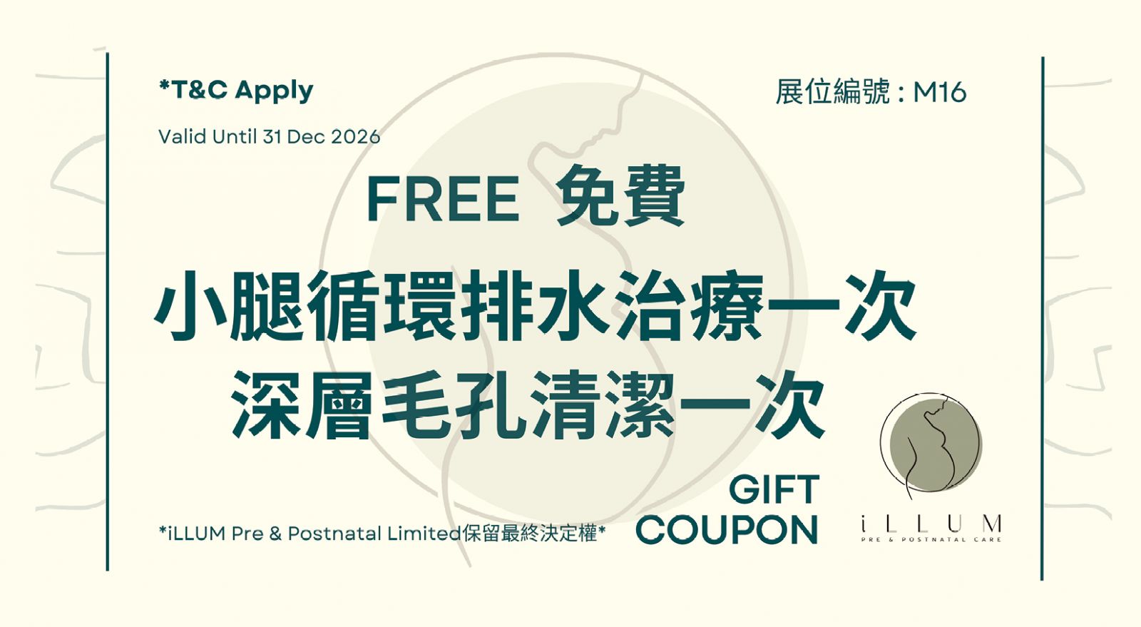 憑券可免費享iLLUM小腿循環排水治療及深層毛孔清潔一次。