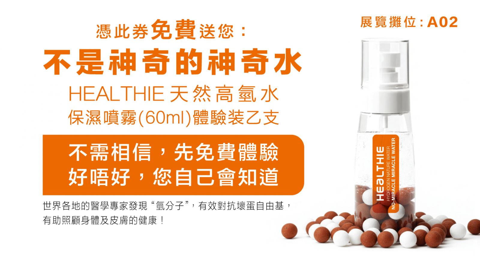 憑劵免費換領HEALTHIE天然高氫水保濕噴霧60ml體驗裝乙支。