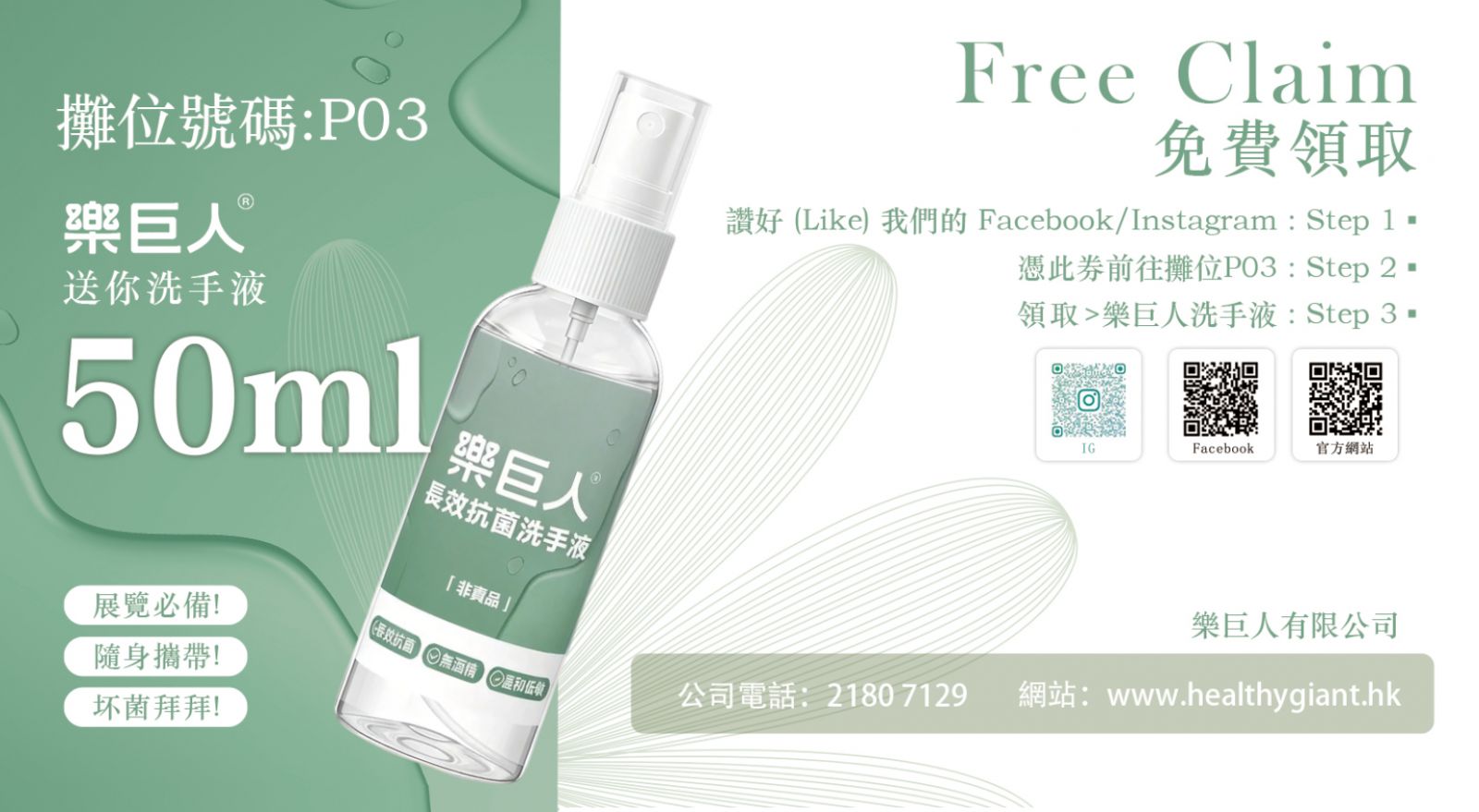 憑劵並讚好Facebook/ Instagram,可獲樂巨人迷你洗手液50ml。