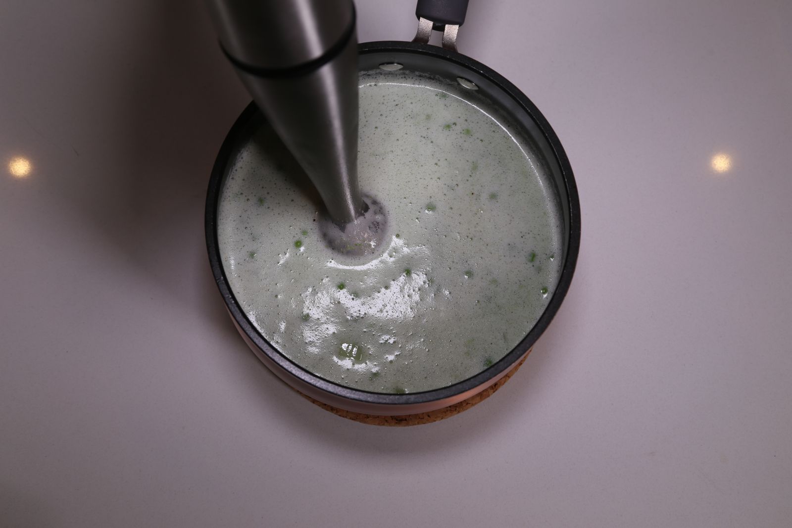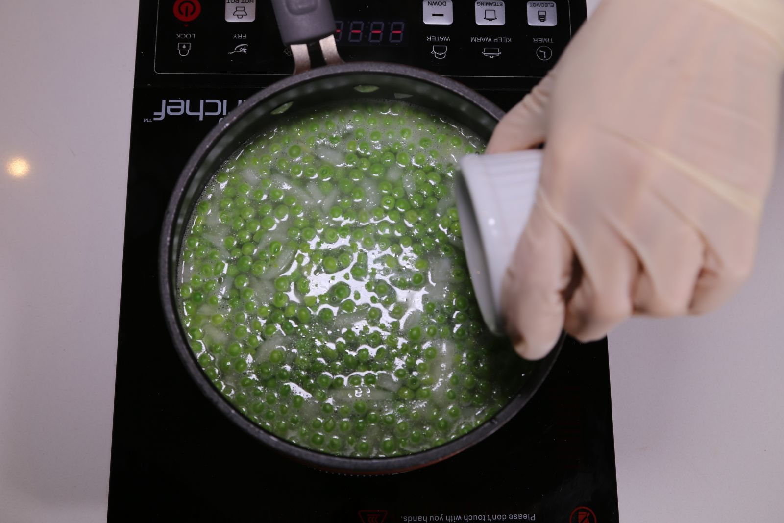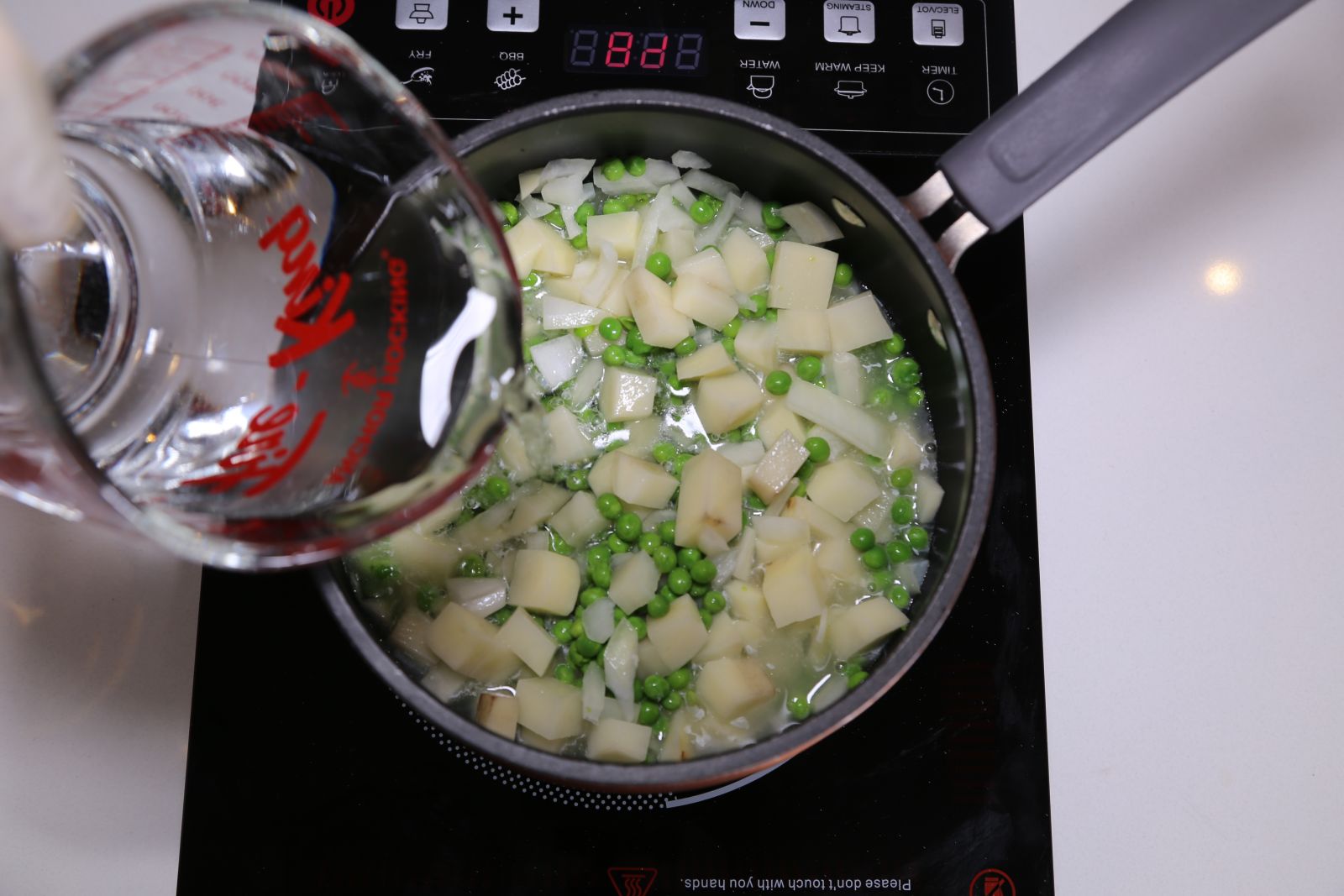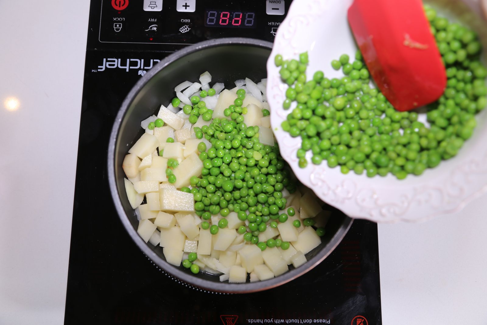 1.大火下牛油落鍋煑溶、炒香洋葱、薯仔、青豆至軟身。