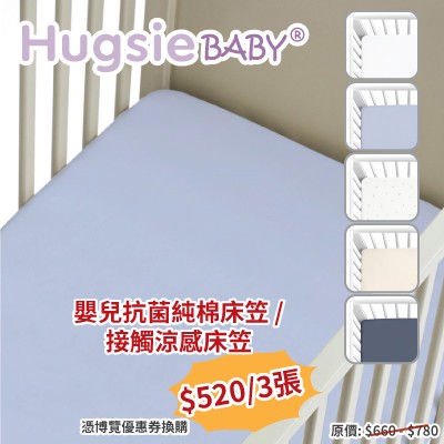 憑博覽優惠券,可以優惠價$520換購3張HugsieBABY嬰兒抗菌純棉床笠/涼感床笠,床笠使用德國醫療級Smartcel sensitive氧化鋅抗菌材質, 不含有害刺激物,抗菌同時質感柔軟,更呵護濕疹及敏感肌膚。