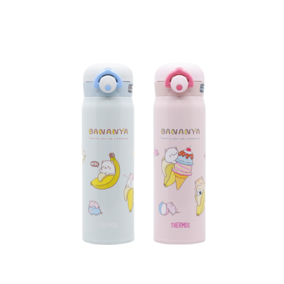 保溫瓶上印有日本動畫角色- 香蕉喵(ばなにゃ) 圖案,保溫瓶除了可隨時補水,用保溫瓶代替塑膠瓶裝水外,帶寶寶外出時,可盛載熱水,方便隨時都可沖奶。