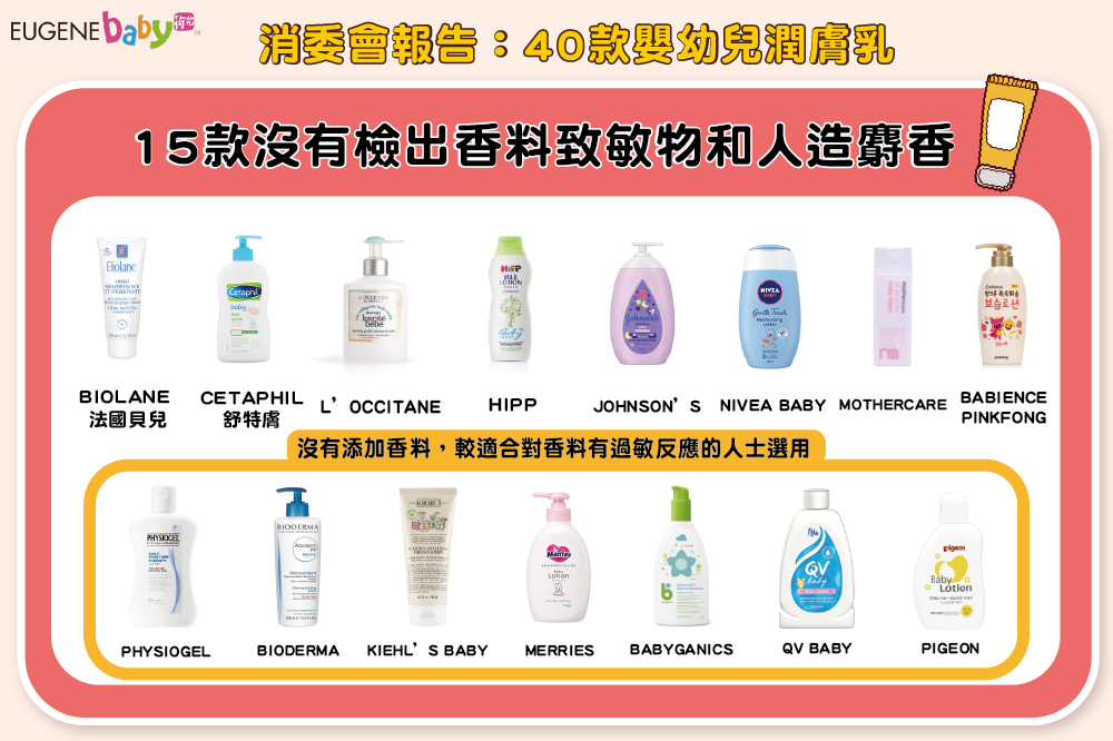 眾多樣本中,Noodle & Boo、趣樂、RICO Baby、CALIFORNIA BABY、Hug、aleva Naturals、博寶、Mustela、erbaviva、puracy、BURT’S BEES BABY、BABY Magic和Aveeno Baby嬰兒薰衣草舒靜保濕乳13款產品,沒有在成分表列明所有檢出濃度逾0.001%的香料致敏物質。