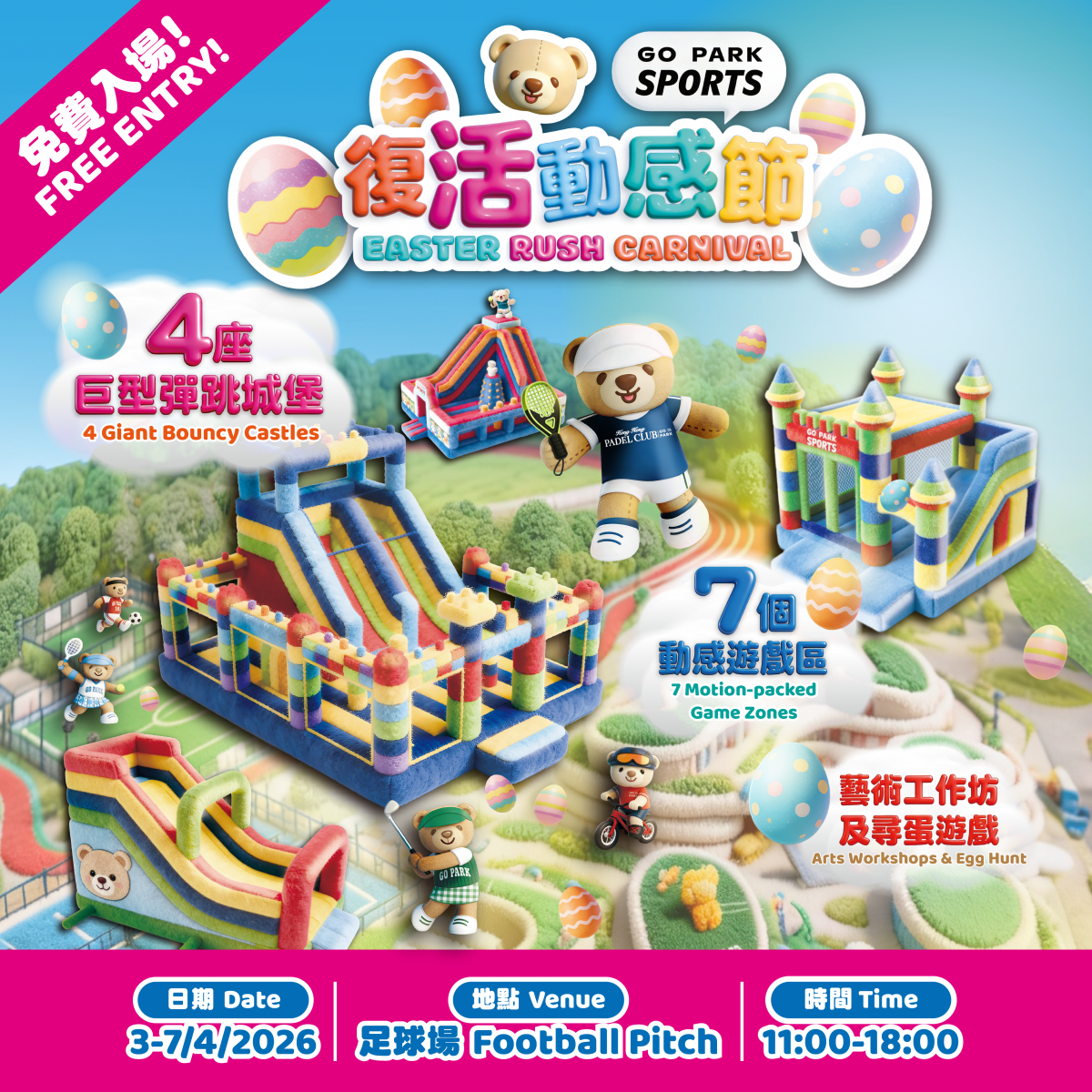 2026年4月3日至7日GO PARK Sports將於足球場舉辦「復活動感節」,場地將化身為色彩繽紛的玩樂天地,開放公眾免費入場,4座巨型彈跳城堡等待大家挑戰,不論大人還是小朋友都可以盡情放電,並可以體驗個刺激動感遊戲區,測試身手,還可參與藝術手作工作坊,發揮創意小宇宙。