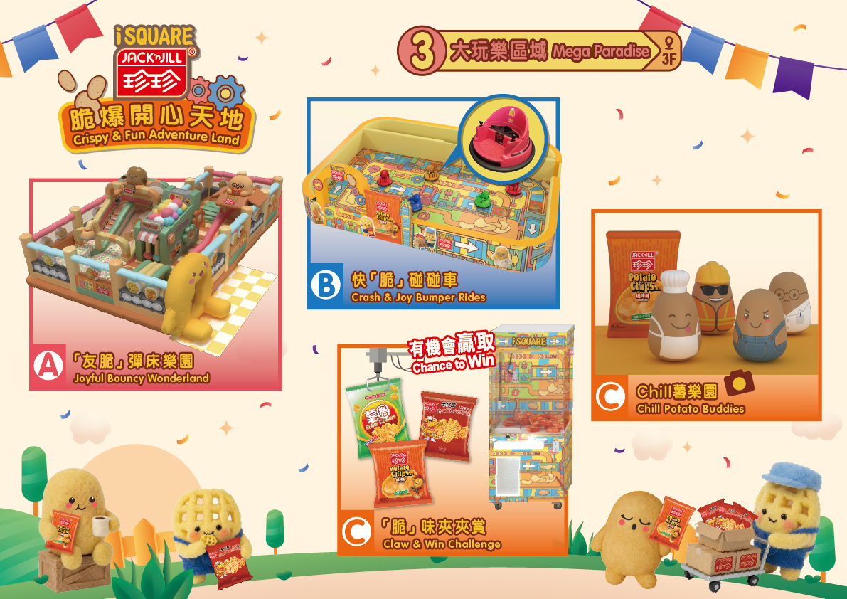 iSQUARE國際廣場聯乘陪伴香港人成長的本地零食品牌Jack’n Jill珍珍薯片,於2026年3月28日起至5月10日期間,隆重呈獻【iSQUARE x Jack’n Jill 珍珍 脆爆開心天地】,3大樂「脆」玩樂區域包括:以薯片製造工房為主題的「友脆」彈床樂園, 3.5米高巨型薯仔微笑入口,及4米高薯仔攀滑區,給小朋友種種體力挑戰,還有快「脆」碰碰車,童趣漫畫風圍欄及運輸帶賽道,坐上可愛碰碰車展示駕駛實力,齊齊「碰」出開心火花,「脆」爆一整天,製造最開心的春日及復活節假期回憶。