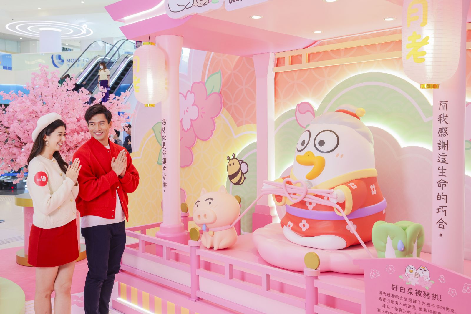 小劉鴨變身成月下老人,將會於新年坐鎮+WOO嘉湖中庭。以粉紅色作為主調的月老廟高逾3米,蘊藏月老征贈給大家的金石良言。無論大家是單身待愛,抑或有影皆雙,月老小劉鴨都會為大家送上最真摯的戀愛祝福,準備好為良緣牽紅線。