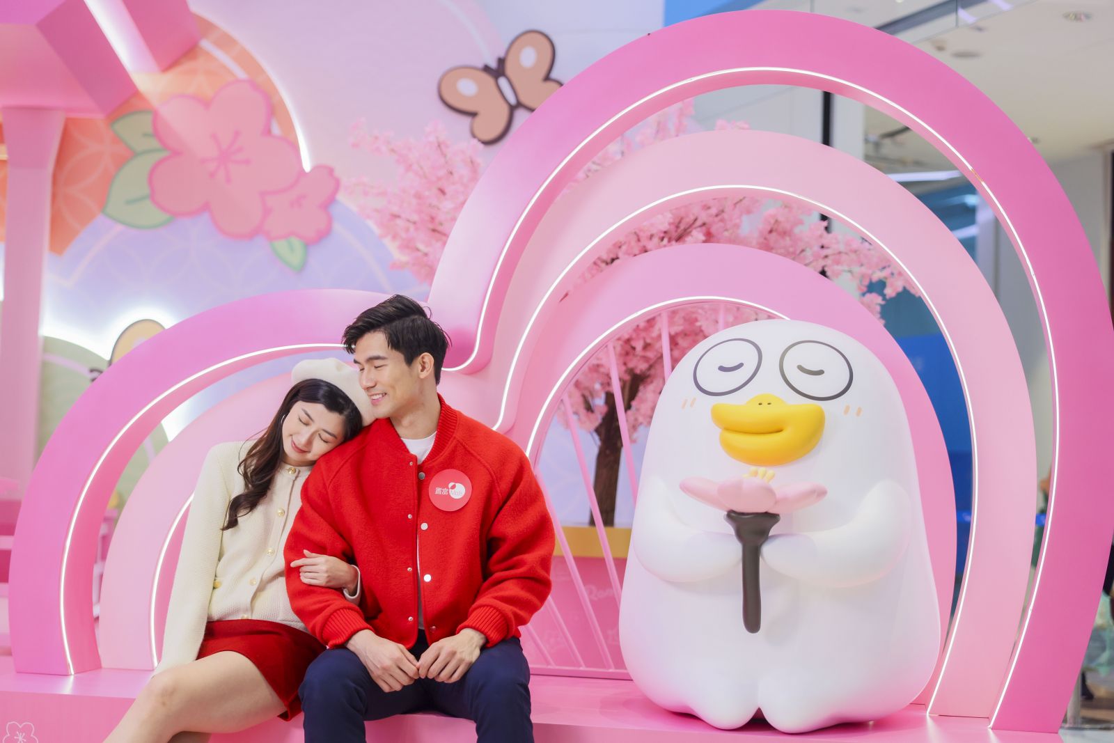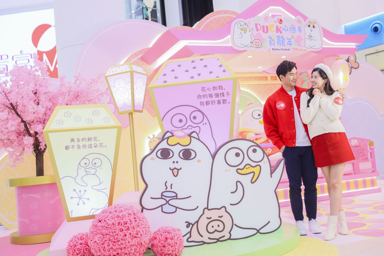 於小劉鴨月老發放的神力下,現場的桃花以最美麗的姿勢綻放。小劉鴨、鼻孔喵與豬豬席地而坐及欣賞花海之餘,旁邊設有高約2米的天燈,寫上愛情宣言。另一邊的愛心造型燈飾打卡位,大家也記得要和陶醉於鮮花的小劉鴨合照,於今個新年甜甜蜜蜜。