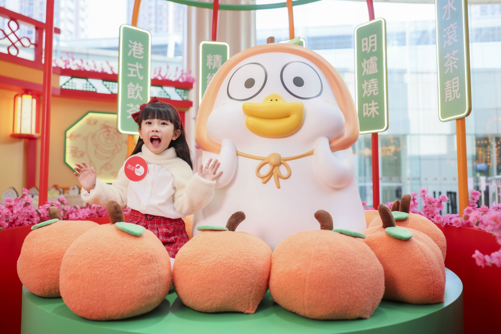一身龍年裝扮的3米高吹氣小劉鴨,置身放滿蝦餃燒賣的傳統竹蒸籠中,特別為大家製作以大紅福袋為創作主題的特備招牌點心。另一邊廂,小劉鴨變身「小桔子」造型,於高達3米的雀籠中,挑選出飽滿紅潤的大桔作為見面禮。