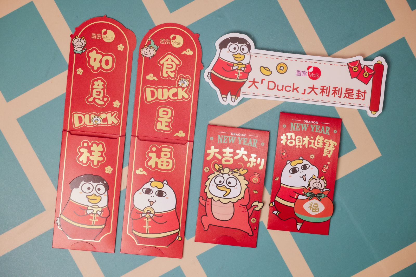 置富 Malls特別推出限量版小劉鴨大「DUCK」大利利是封,一套2款共8個,分別是「大吉大利 x 食DUCK是福」利是封及「招財進寶 x 如意DUCK祥」利是封。